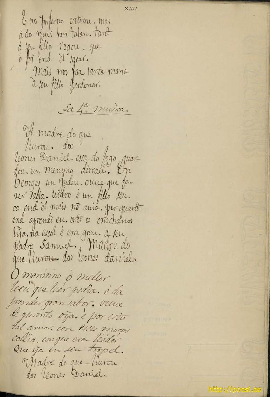 CANTIGA IV. Copia d' las Cantigas del rey don Alfonso el Sabio según los 2 códices del Escorial con las notas citas e índices de los mismos para la publicación q proyectaba Florencio Janer. Biblioteca Nacional de España. Madrid, (Mss. 5.982)