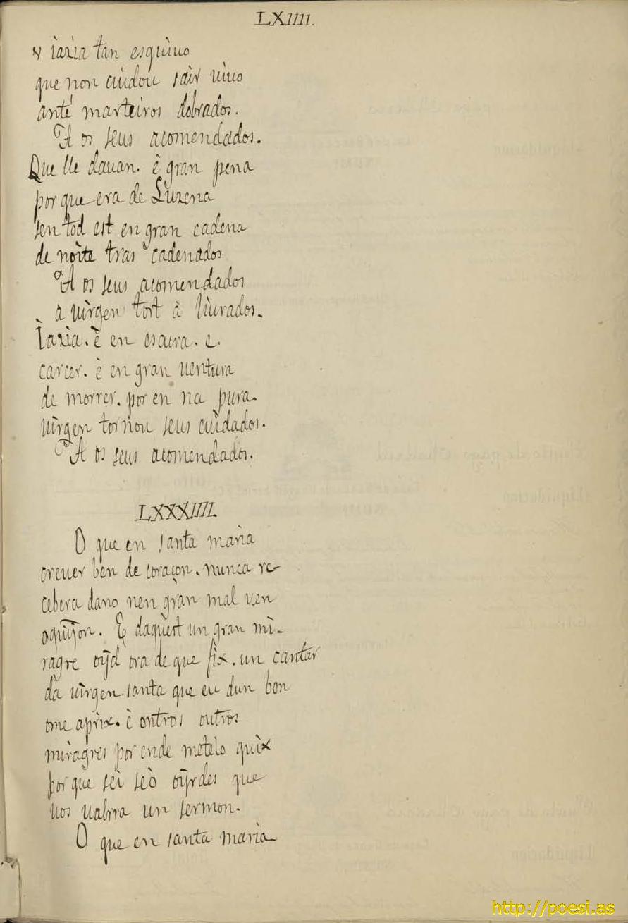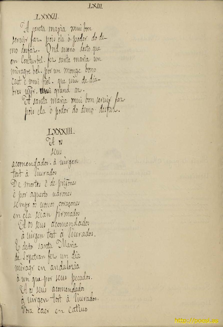 CANTIGA LXXXIII. Copia d' las Cantigas del rey don Alfonso el Sabio según los 2 códices del Escorial con las notas citas e índices de los mismos para la publicación q proyectaba Florencio Janer. Biblioteca Nacional de España. Madrid, (Mss. 5.982)