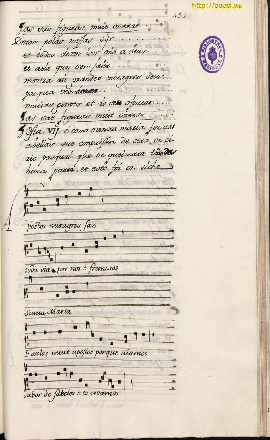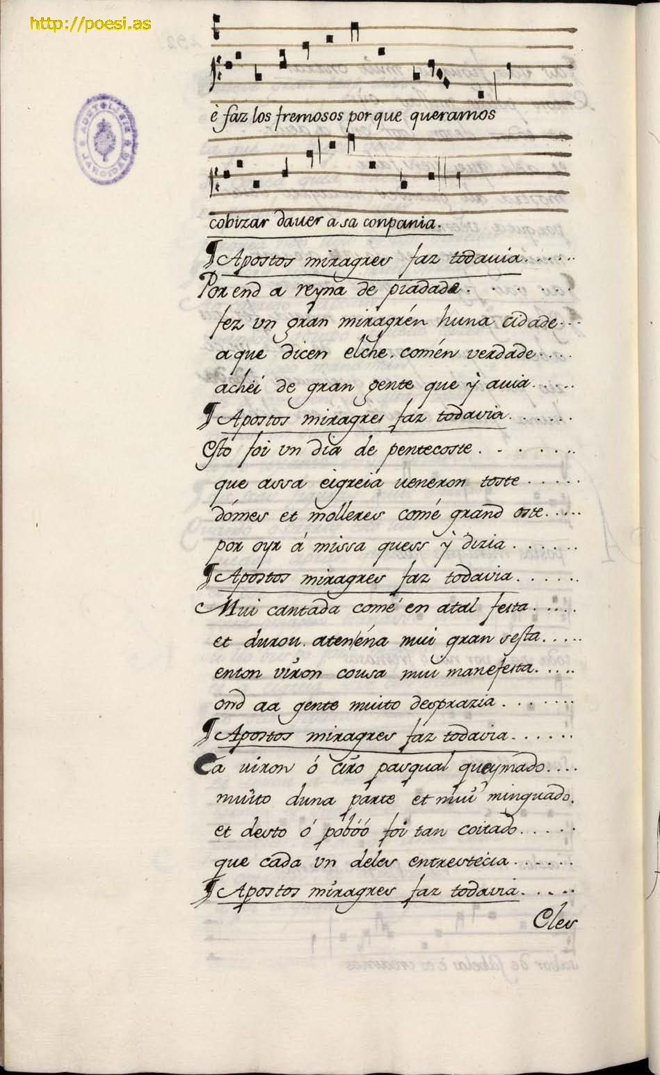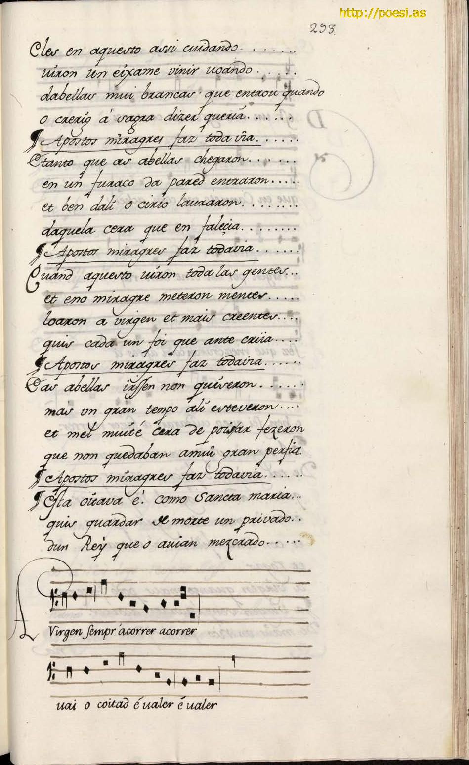 Incluido en Cantigas de Santa María de D. Alonso Décimo, llamado el Sabio; ofrecidas a la Reina Nuestra Señora por el P. Andrés Burriel de la Compañía de Jesús. Biblioteca Nacional de España. Madrid, (Mss. 13.055)