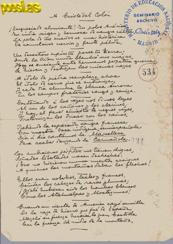 Manuscrito original de Rubén Darío
